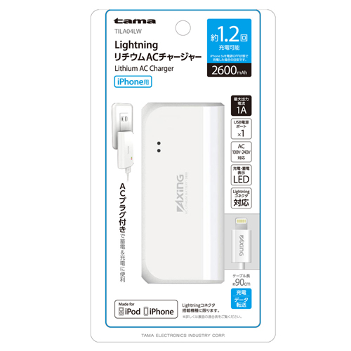 - ・TILA04LW “Lightning リチウム AC チャージャー 2600″|製品情報|多摩電子工業株式会社:https://www.tamadenco.co.jp/products/itemDetail.php?item_no=814