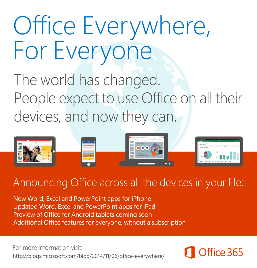 - ・More Office. Everywhere you need it. – The Official Microsoft Blog:https://blogs.microsoft.com/blog/2014/11/06/office-everywhere/