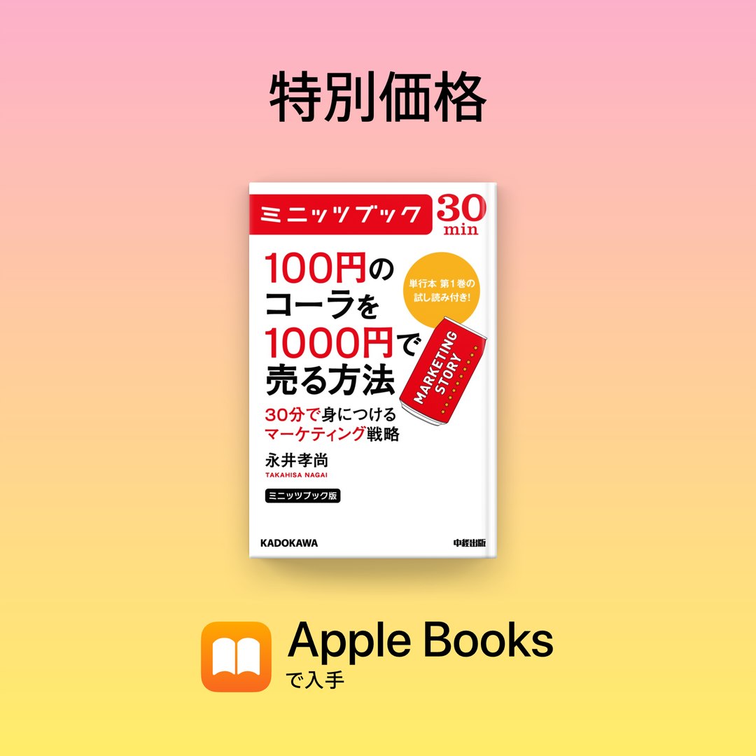 Apple が期間限定で電子書籍を特価で販売する “今週のブック” にて、”永井 孝尚” 著の “ミニッツ ブック版 100 円のコーラを 1,000 円で売る方法 30 分で身につけるマーケティング戦略” をピック アップしています。