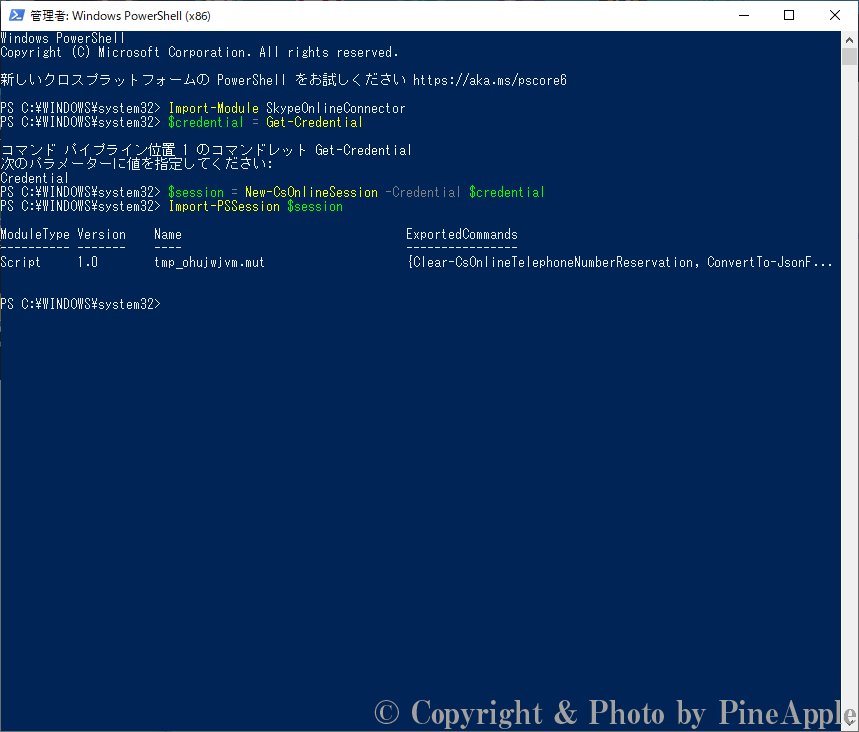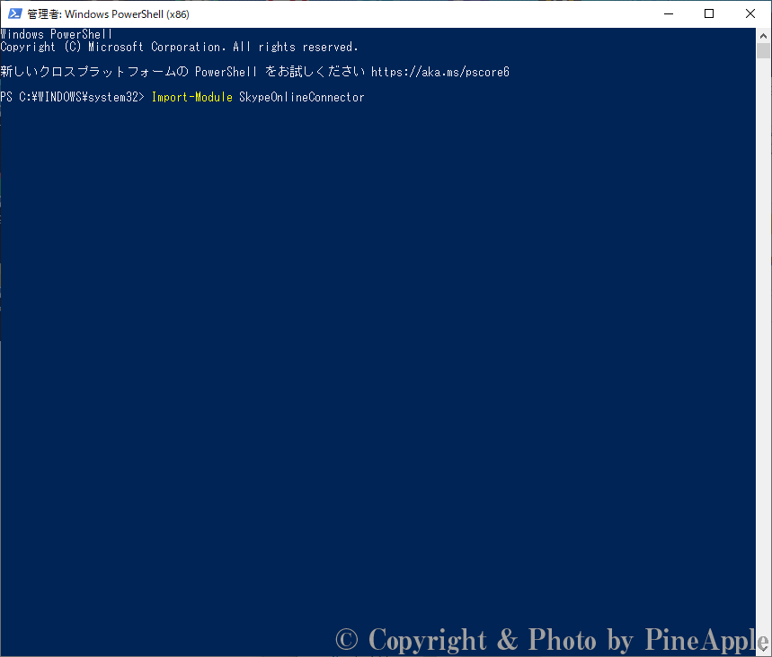 “Microsoft Teams PowerShell モージュール” のインストールの完了後、”Import-Module MicrosoftTeams” コマンドレットを入力し、[Enter] キーを押し、Microsoft Teams をインポートします。