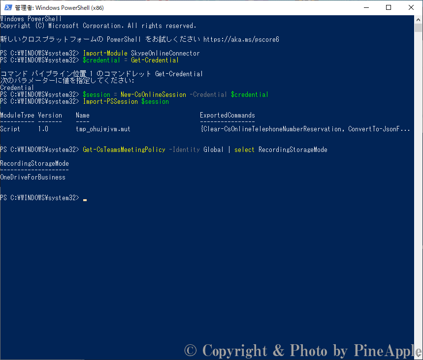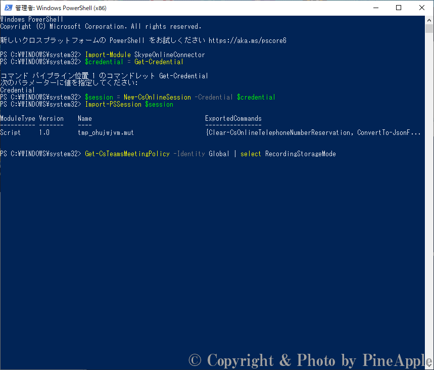 “Get-CsTeamsMeetingPolicy -Identity “確認するポリシー名” | Select RecordingStorageMode” を入力し、[Enter] キーを押し、保存先の結果を確認します。