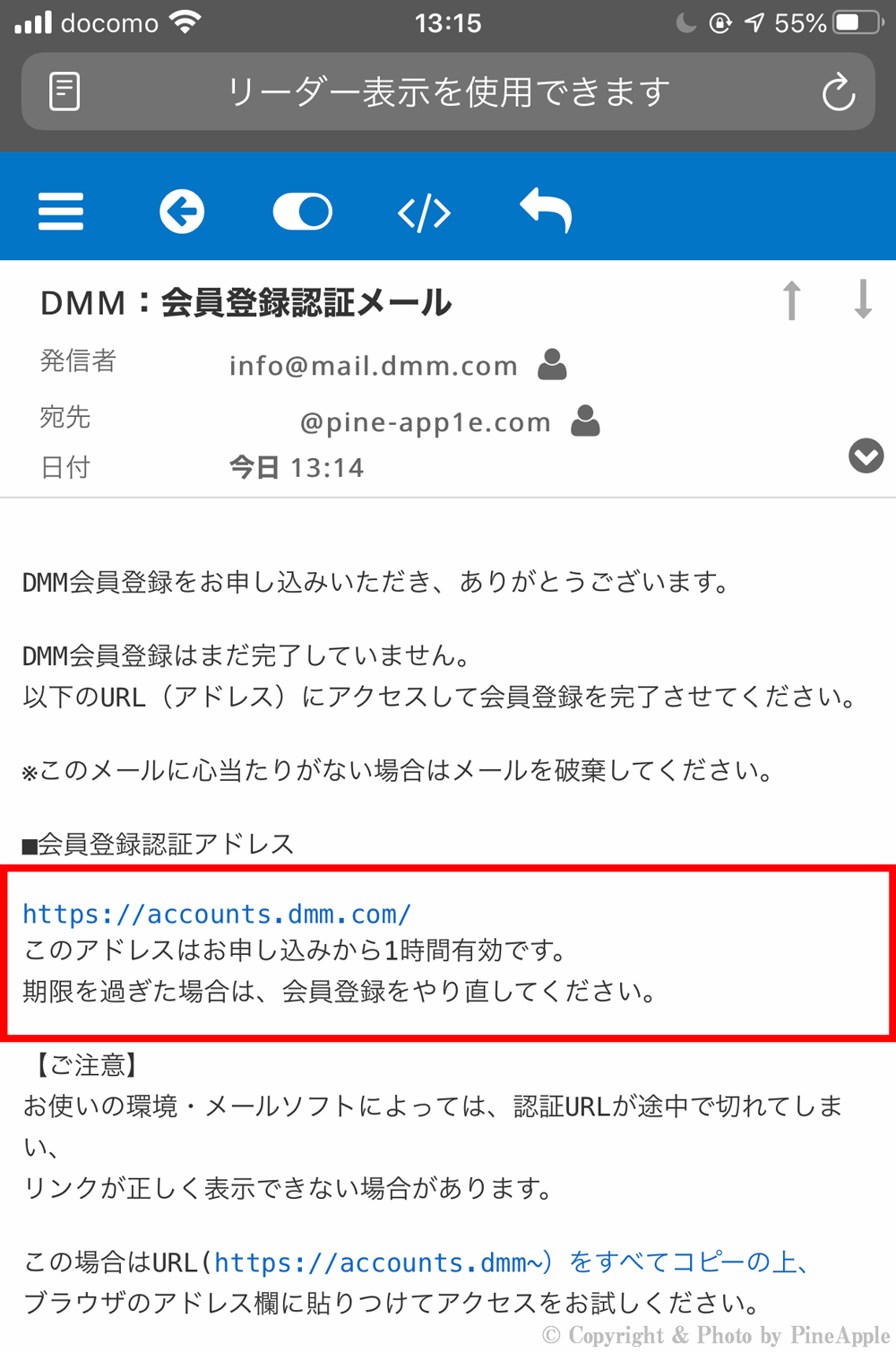 DMM アカウント:”info@mail.dmm.com” から受信したメールに記載されている “会員登録認証アドレス” の URL をタップ
