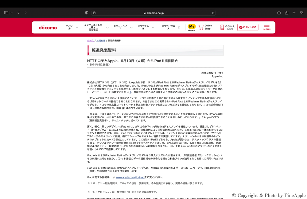 - ・報道発表資料:NTT ドコモと Apple、6 月 10 日(火曜)から iPad を提供開始|お知らせ|NTT ドコモ:https://www.docomo.ne.jp/info/news_release/2014/05/28_00.html