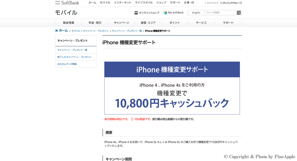 “iPhone 4s”、”iPhone 4″ を利用中で、”iPhone 5s” もしくは “iPhone 5c” の購入を伴う機種変更で 10,800 円キャッシュ バックします。