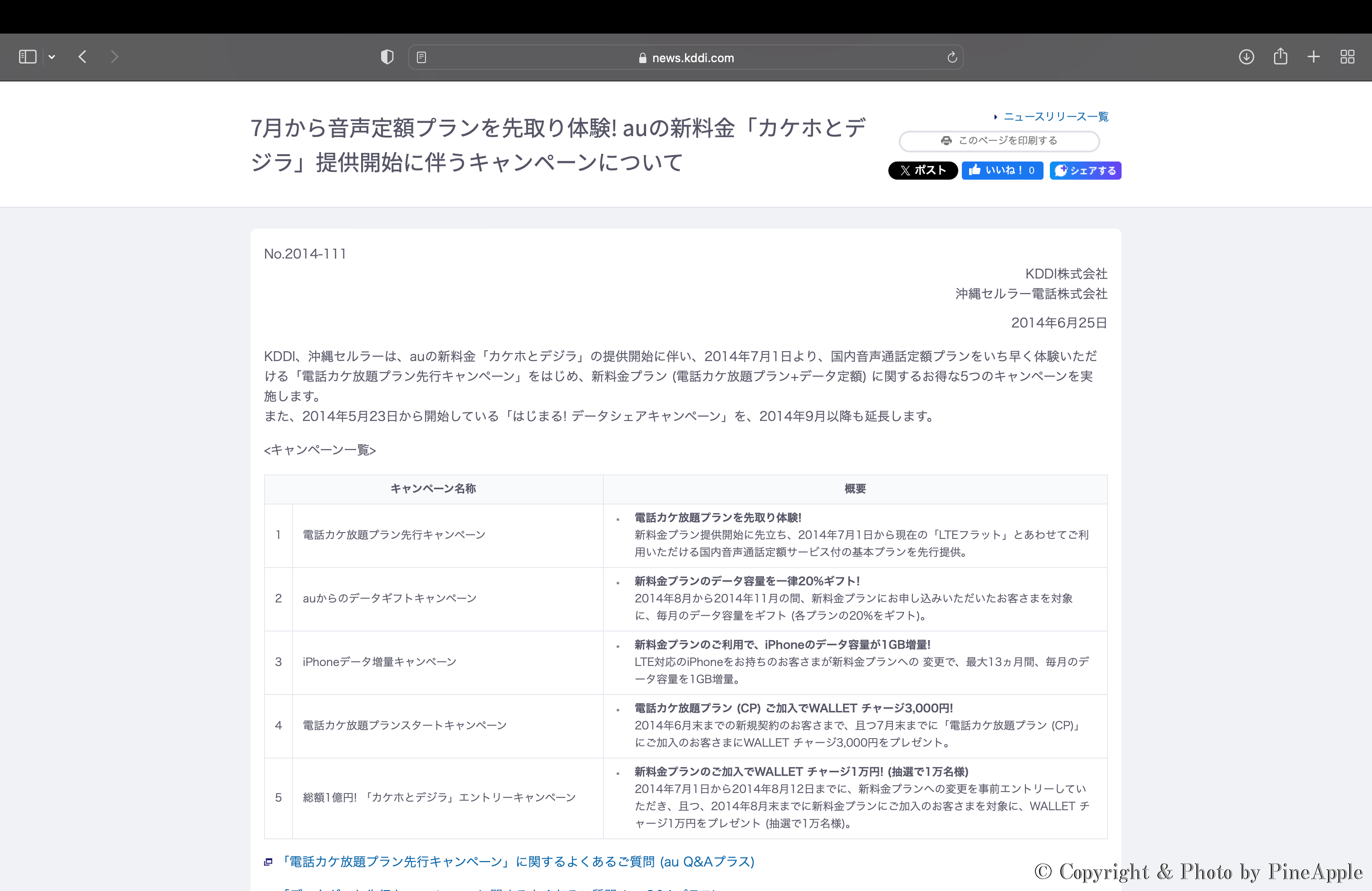 - ・7 月から音声定額プランを先取り体験!au の新料金 “カケホとデジラ” 提供開始に伴うキャンペーンについて|2014 年|KDDI 株式会社:https://news.kddi.com/kddi/corporate/newsrelease/2014/06/25/437.html