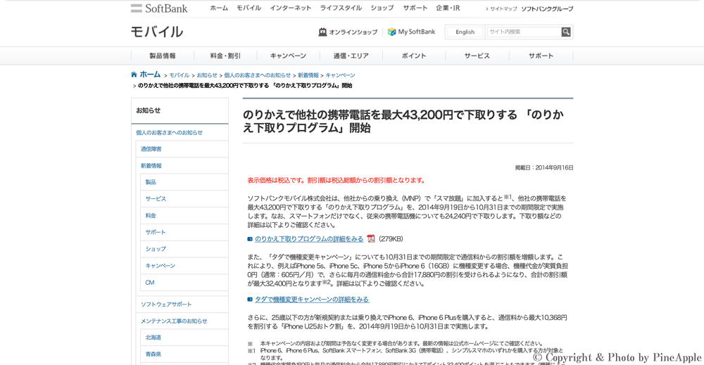 - ・のりかえで他社の携帯電話を最大 43,200 円で下取りする “のりかえ下取りプログラム” 開始|個人のお客さまへのお知らせ|お知らせ|モバイル|ソフトバンク:http://www.softbank.jp/mobile/info/personal/news/cm_campaign/20140916b/