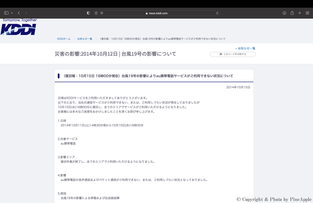 - ・(復旧報:10 月 15 日 16 時 00 分現在)台風 19 号の影響により au 携帯電話サービスがご利用できない状況について:https://news.kddi.com/important/news/important_2014101593.html
