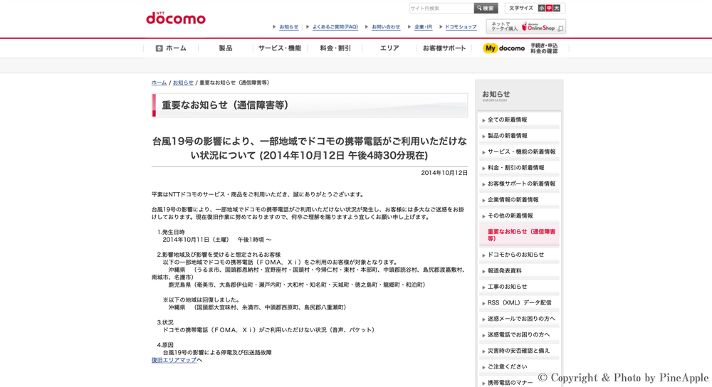 - ・重要なお知らせ(通信障害等):台風 19 号の影響により、一部地域でドコモの携帯電話がご利用いただけない状況について|お知らせ|NTT ドコモ:https://www.docomo.ne.jp/info/network/kanto/pages/141012_00_m.html