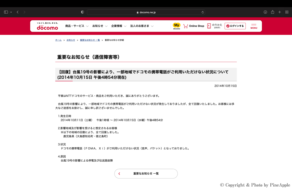 【トラブルシューティング】”NTT docomo” の台風 19 号による停電および伝送路故障の影響による一部地域携帯電話サービスへの障害が改善したことを案内
