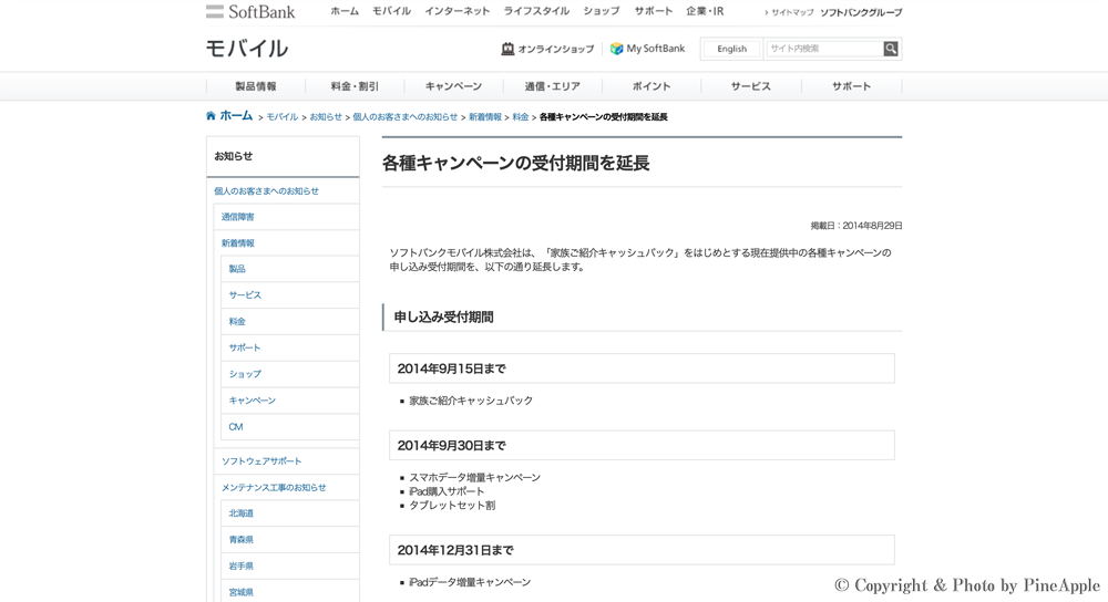 - ・各種キャンペーンの受付期間を延長|個人のお客さまへのお知らせ|お知らせ|モバイル|ソフトバンク:https://www.softbank.jp/mobile/info/personal/news/price_plan/20140829a/