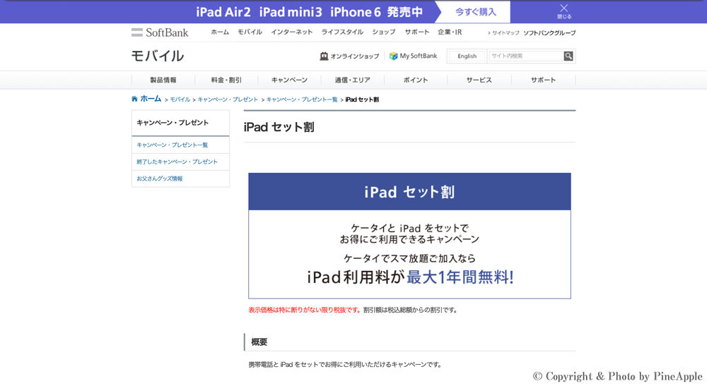 - ・iPad Air 2、iPad mini 3 利用料が最大 1 年間無料!さらに iPad 下取り最大 22,800 円!|個人のお客さまへのお知らせ|お知らせ|モバイル|ソフトバンク:https://www.softbank.jp/mobile/info/personal/news/cm_campaign/20141020a/