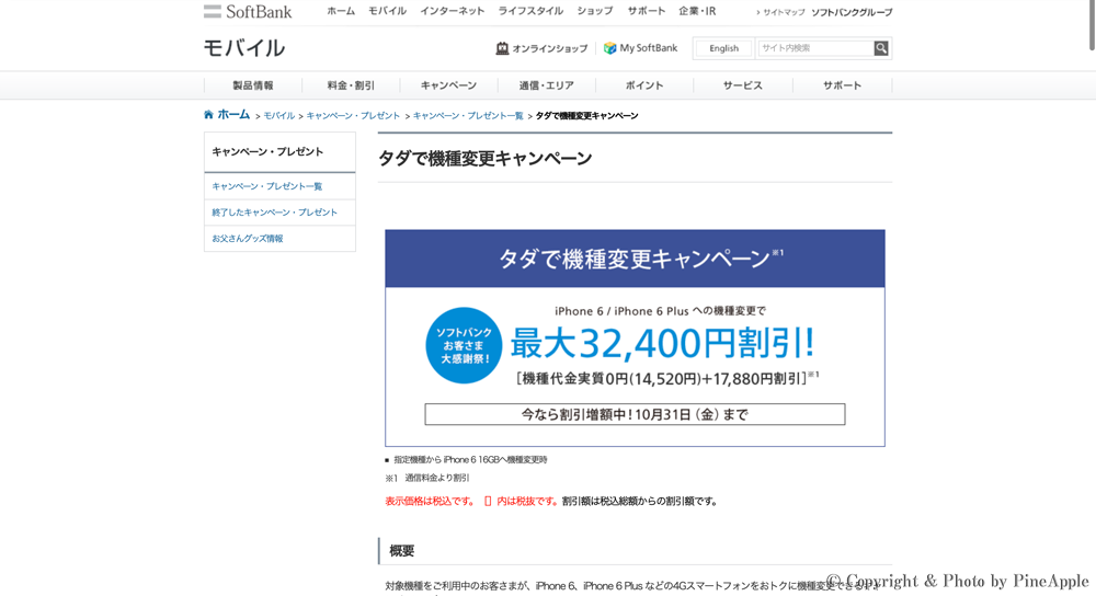 - ・実質 0 円から “iPhone 6” に機種変更できるキャンペーン開始、さらに最大 10,800 円の割引!iPad を最大 1 年無料で使えるキャンペーンも!|個人のお客さまへのお知らせ|お知らせ|モバイル|ソフトバンク:https://www.softbank.jp/mobile/info/personal/news/cm_campaign/20140912a/