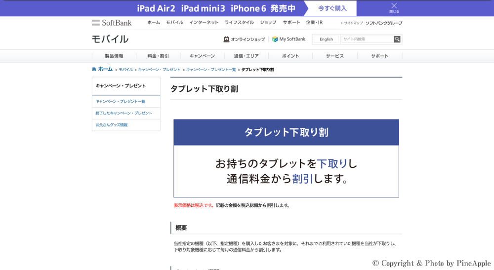 - ・iPad Air 2、iPad mini 3 利用料が最大 1 年間無料!さらに iPad 下取り最大 22,800 円!|個人のお客さまへのお知らせ|お知らせ|モバイル|ソフトバンク:https://www.softbank.jp/mobile/info/personal/news/cm_campaign/20141020a/