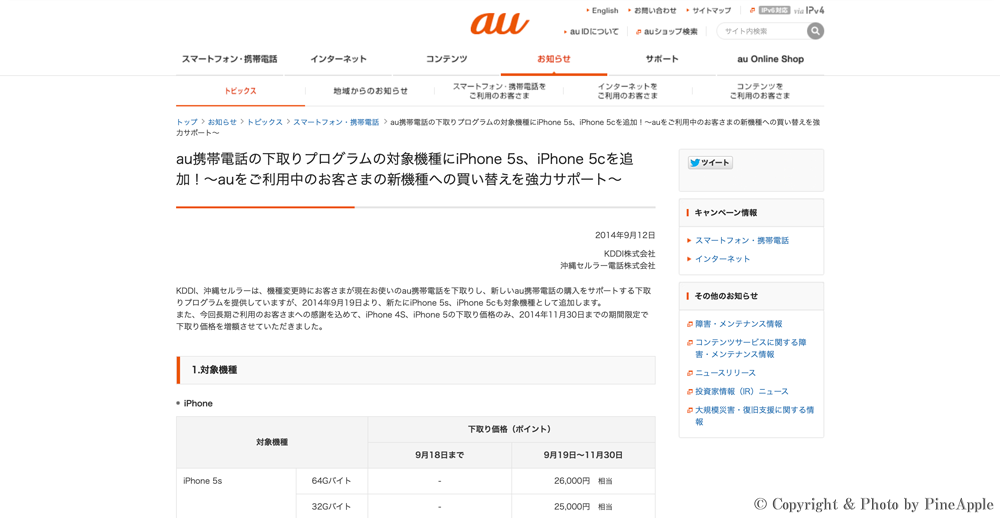 - ・au 携帯電話の下取りプログラムの対象機種に iPhone 5s、iPhone 5c を追加!~ au をご利用中のお客さまの新機種への買い替えを強力サポート ~|スマートフォン・携帯電話|au:https://www.au.kddi.com/information/topic/mobile/20140912-02.html
